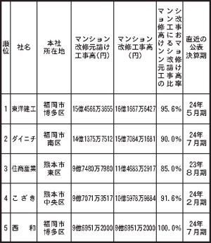 順位,社名,本社 所在地,マンション 改修元請け 工事高(円),マンション 改修工事高 (円),マンション改修工事高におけるマンション改修元請け工事高の比率,直近の 公表 決算期 1,東洋建工,福岡市 博多区,15億4566万3655,16億1667万6427,95.6%,24年 5月期 2,ダイニチ,福岡市 南区,14億1375万7512,15億7084万1681,90.0%,24年 7月期 3,住商産業,熊本市 東区,9億7480万7980,11億4683万2917,85.0%,23年 8月期 4,こざき,熊本市 中央区,9億7071万3517,10億5978万9884,91.6%,24年 2月期 5,西和,福岡市 博多区,9億6951万2000,9億6951万2000,100.0%,24年 7月期