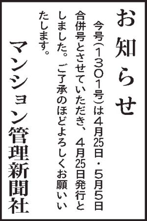 今号(1301号)は4月25日・5月5日合併号とさせていただき、4月25日発行としました。ご了承のほどよろしくお願いいたします。,お知らせ