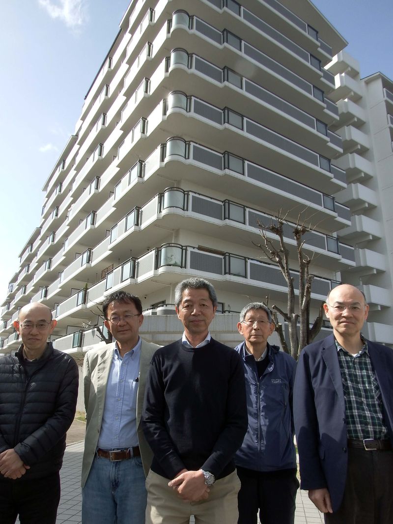 将来的に「管理業者管理者方式」の導入も「やっていかないといけないのかなと思う。まだまだ大丈夫ですがあと20年、30年もしたら、そうなっていくんじゃないかなと思っている」と話している。 左から理事の太田文夫さん、副理事長の早川久登さん、理事長の三浦元嗣さん、元理事長の梶山貴美晴さん、理事の辻尚宏さん。今後の課題は高齢化で役員を引き受けない人が出てきたときの対応だという