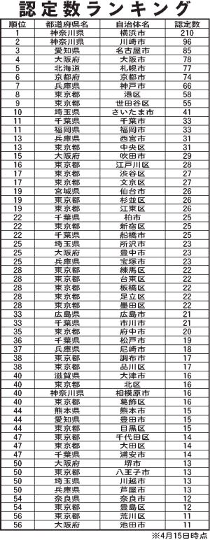 認定数ランキング 順位,都道府県名,自治体名,認定数 1,神奈川県,横浜市,210 2,神奈川県,川崎市,96 3,愛知県,名古屋市,85 4,大阪府,大阪市,78 5,北海道,札幌市,77 6,京都府,京都市,74 7,兵庫県,神戸市,66 8,東京都,港区,58 9,東京都,世田谷区,55 10,埼玉県,さいたま市,41 11,千葉県,千葉市,33 11,福岡県,福岡市,33 13,兵庫県,西宮市,31 13,東京都,中央区,31 15,大阪府,吹田市,29 16,東京都,江戸川区,28 17,東京都,渋谷区,27 17,東京都,文京区,27 19,宮城県,仙台市,26 19,東京都,杉並区,26 19,東京都,江東区,26 22,千葉県,柏市,25 22,東京都,新宿区,25 22,千葉県,船橋市,25 25,埼玉県,所沢市,23 25,大阪府,豊中市,23 25,兵庫県,宝塚市,23 28,東京都,練馬区,22 28,東京都,台東区,22 28,東京都,板橋区,22 28,東京都,足立区,22 28,東京都,墨田区,22 33,広島県,広島市,21 33,千葉県,市川市,21 35,東京都,府中市,20 36,千葉県,松戸市,19 37,兵庫県,尼崎市,18 38,東京都,調布市,17 38,東京都,品川区,17 40,滋賀県,大津市,16 40,東京都,北区,16 40,神奈川県,相模原市,16 40,東京都,葛飾区,16 44,熊本県,熊本市,15 44,愛知県,豊田市,15 44,東京都,目黒区,15 47,東京都,千代田区,14 47,東京都,大田区,14 47,千葉県,浦安市,14 50,大阪府,堺市,13 50,東京都,八王子市,13 50,埼玉県,川越市,13 50,兵庫県,芦屋市,13 54,奈良県,奈良市,12 54,東京都,豊島区,12 56,東京都,荒川区,11 56,大阪府,池田市,11 ※4月15日時点