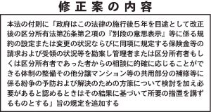 管理不全マンションの支援や「マンション管理適正化支援法人」への登録働き掛けをなども盛り込んだ。 修正案の内容 本法の付則に「政府はこの法律の施行後5年を目途として改正後の区分所有法第26条第2項の『別段の意思表示』等に係る規約の設定または変更の状況ならびに同項に規定する保険金等の請求および受領の状況等を勘案し管理者または区分所有者もしくは区分所有者であった者からの相談に的確に応じることができる体制の整備その他分譲マンション等の共用部分の補修等に係る紛争の予防および解決のための方策について検討を加え必要があると認めるときはその結果に基づいて所要の措置を講ずるものとする」旨の規定を追加する