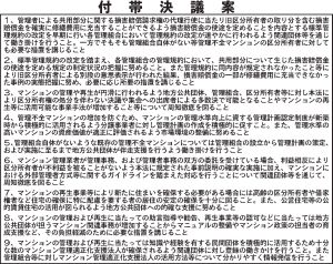 付帯決議案 1、管理者による共用部分に関する損害賠償請求権の代理行使に当たり旧区分所有者の取り分を含む損害賠償金を確実に修繕費用に充当することができるよう損害賠償金の使途を定めることを内容とする標準管理規約の改定を早期に行い各管理組合において管理規約の改定が速やかに行われるよう関連団体等を通じて働き掛けを行うこと。一方でそもそも管理組合自体がない等管理不全マンションの区分所有者に対しても必要な措置を講じること 2、標準管理規約の改定を踏まえ、各管理組合の管理規約において、共用部分について生じた損害賠償金の使途を定める規定の制定状況の把握に努めること。また管理規約に同内容が規定されなかったこと等により旧区分所有者による別段の意思表示が行われた結果、損害賠償金の一部が修繕費用に充当できなかった事例の実態把握に努め、必要に応じ所要の措置を講じること 3、マンションの管理や再生が円滑に行われるよう地方公共団体、管理組合、区分所有者等に対し本法により区分所有権の処分を伴わない決議や集会への出席者による多数決で可能となることやマンションの再生等に活用可能な事業手法が増加すること等について周知徹底を図ること 4、管理不全マンションの増加を防ぐため、マンションの管理水準向上に資する管理計画認定制度が新築時から積極的に活用されるよう分譲事業者に対し管理計画の作成を積極的に促すこと。また、管理水準の高いマンションの資産価値が適正に評価されるよう市場環境の整備に努めること 5、管理組合自体がないような既存の管理不全マンションについては管理組合の設立から管理計画の策定、および実施に至るまで地方公共団体が伴走支援を行うよう働き掛けを行うこと 6、マンション管理業者が管理事務、および管理者事務の双方の委託を受けている場合、利益相反により区分所有者が不利益を被ることがないよう本法に規定された事前説明の確実な実施に加え、マンションにおける外部管理者方式等に関するガイドラインを踏まえた対応を行うことについて関連団体等を通じて、周知徹底を図ること 7、マンションの再生事業等により新たに住まいを確保する必要がある場合には高齢の区分所有者や借家権者など住宅の確保に特に配慮を要する者の居住の安定の確保を十分に図ること。また、公営住宅等の公的賃貸住宅の活用が図られるよう地方公共団体への的確な支援に努めること 8、マンションの管理および再生に当たっての助言指導や勧告、再生事業等の認可などに当たっては地方公共団体が担うマンション関連事務が増加することからマニュアルの整備やマンション政策の担当者の育成支援など、その負担軽減のために必要な措置を講じること 9、マンションの管理および再生に当たっては知識や経験を有する民間団体を積極的に活用するため十分な数のマンション管理適正化支援法人が確保されるよう関連団体に対し登録の働きかけを行うこと。また管理組合等に対しマンション管理適正化支援法人の活用方法等について分かりやすく情報発信を行うこと