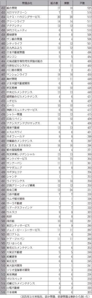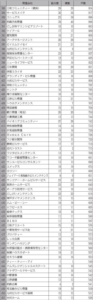 ,管理会社,組合数,棟数,戸数 452,総合管財,17,18,525 453,大日ママクリーン,7,7,518 454,ミナミ・ハウジングサービス,20,20,512 455,クリーンライフ,14,14,511 456,アクアシティ,12,12,510 456,享代コミュニティ,6,6,510 458,菱建商事,8,8,506 458,サン総合管理,4,4,506 460,シティライフ,6,12,501 461,北九州ふよう,12,12,500 462,日本不動産管理,8,8,496 463,ヨシコン,5,5,484 464,北海道勤労者住宅生活協同組合,8,8,468 465,白洋社ビルシステム,1,11,460 466,川口都市開発,2,2,451 467,マンションライフ,18,18,450 468,奥村管財,11,11,449 468,JR四国不動産開発,6,6,449 470,相互整美,10,10,448 471,中央ビルメンテナンス,13,13,440 472,盛岡総合ビルメンテナンス,4,6,431 473,ニチビル,8,8,427 474,エール,10,10,418 475,神鉄コミュニティサービス,6,16,417 476,シャトー管理,12,12,415 477,広島リバイン,10,10,409 478,アクシスアンドプロマックス,8,8,408 479,関兼不動産,13,13,407 480,エスエスワイ,6,6,401 481,ネオフィールド,8,8,399 482,信越総合メンテナンス,6,6,397 483,CREA