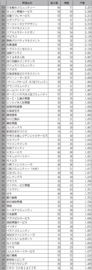 ,管理会社,組合数,棟数,戸数 259,日本総合コミュニティー,66,71,2,225 260,タッケン管理サービス,58,59,2,220 261,近藤リフレサービス,67,67,2,212 262,エヴァクリーン,16,41,2,210 262,フージャースケアデザイン,12,12,2,210 264,ナイスマネジメント,52,52,2,192 265,リアルエステートナガノ,54,54,2,190 266,サビスコ,37,39,2,145 266,静鉄プロパティマネジメント,39,30,2,145 268,和興通商,52,52,2,134 269,トラストコンセルジュ,53,68,2,124 270,遠鉄アシスト,45,45,2,091 271,STAR合人社,48,52,2,067 272,西日本綜合メンテナンス,34,34,2,052 273,サジェストコミュニティ,60,60,2,045 274,アクタス,36,36,2,026 275,北海道東急ビルマネジメント,49,50,2,021 276,グリーン・サービス,25,47,2,009 277,パナソニックホームズ・合人社コミュニティ,29,30,1,994 278,グランコミュニティ,41,41,1,983 279,ホームパートナーズ,37,37,1,967 280,オープンハウス合人社コミュニティ,57,57,1,965 281,S・C・L総合管理,35,35,1,942 282,シンエイ合人社管理,38,38,1,939 283,曲堀幸和産業,30,43,1,938 284,北海道互光,38,38,1,898 285,興栄商事,38,40,1,888 286,中川工務店,31,31,1,875 287,興和管理,64,64,1,871 288,ユニテックス,30,30,1,867 289,新長田まちづくり,19,21,1,854 290,中央日土地レジデンシャルサービス,34,40,1,847 291,エルベック,43,43,1,844 291,フジメンテナンス,45,45,1,844 293,生和アメニティ,40,40,1,824 294,エヌシーエス,66,66,1,821 294,マネッジパートナー,36,36,1,821 296,モトムラ,43,43,1,818 296,大林ファシリティーズ,26,26,1,818 298,三和コミュニティー(大分),51,51,1,817 298,三立プレコン,49,50,1,817 300,エレマックス,48,49,1,810 301,クラリス,32,33,1,796 302,ロイヤル・ビル管理,62,63,1,777 303,イエスマン,60,63,1,761 304,ゼオ,46,46,1,757 305,朝日総業,31,35,1,753 306,安田建物管理,42,42,1,746 307,美建,33,34,1,732 308,トータテコミュニティ,19,20,1,723 309,日本総管,55,56,1,698 309,アズマビルサービス,38,39,1,698 311,建物管理サービス,33,33,1,689 312,ベツダイ,49,49,1,674 313,ベストコミュニティ,38,38,1,667 314,MMSファシリティーズ,16,16,1,627 315,ネストルームサポート,35,35,1,625 316,セイビ大阪,16,19,1,604 317,コスモ,20,23,1,589 318,コムエステートサービス,38,38,1,577 319,毎日興業,57,57,1,524 320,新昭和リビンズ,24,24,1,508 321,フクダハウジング,20,20,1,498 322,TEO