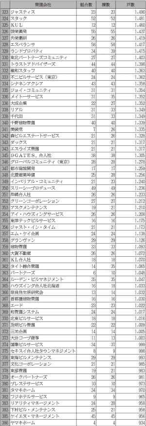 TORIATTE,34,34,1,496,管理会社,組合数,棟数,戸数 323,ジャスティス,23,23,1,490 324,スタック,52,52,1,481 325,KUL,12,12,1,460 326,辰栄興発,55,55,1,437 327,共栄薬研,26,26,1,419 328,エスペランサ,58,58,1,417 329,ランドプロパティ,34,39,1,415 330,東北パートナーズコミュニティ,27,27,1,403 331,トラストアドバイザーズ,44,44,1,398 332,槇和スタッフ,40,40,1,363 333,不二ビルサービス(東京),24,24,1,362 334,シナネンアクシア,43,43,1,358 335,ジョイ・コミュニティ,31,31,1,354 336,メイトーサービス,31,35,1,352 336,大成企業,22,27,1,352 338,リアル,31,33,1,349 338,千代田,31,33,1,349 340,千野建物管理,40,40,1,339 341,美装堂,7,26,1,335 342,森ビルエステートサービス,21,26,1,328 343,ダックス,21,21,1,317 343,エスライズ管理,21,21,1,317 345,9GATES.合人社,38,38,1,305 346,グローバルコミュニティ(東京),28,28,1,278 347,都市環境開発,17,17,1,259 348,北菱産業埠頭,25,28,1,256 349,インペリアル・コミュニティ,21,23,1,240 350,スリーシープロデュース,49,49,1,236 351,沖縄合人社,26,26,1,233 352,クリーンコーポレーション,27,27,1,212 353,アスクメンテナンス,19,21,1,210 354,アイ・ハウズィングサービス,26,26,1,208 355,東洋テックビルサービス,16,16,1,175 356,ジャスト・イン・タイム,21,21,1,173 357,エム・ケイ企画,24,24,1,138 358,グランヴァン,29,29,1,126 359,建物管理,33,33,1,093 360,大賀不動産,26,26,1,072 361,KL合人社,18,18,1,070 362,タイト綜合管理,14,35,1,065 363,パートナーズ,6,10,1,048 364,ルーデン・ビルマネジメント,35,35,1,047 365,ハウズイング合人社北海道,16,18,1,033 366,奈良住生活研究会,13,14,1,032 367,首都圏建物管理,16,16,1,030 368,エード,23,23,1,022 369,和管理システム,24,24,1,017 370,北東ビルサービス,18,18,1,016 371,及明ビル管理,22,22,1,009 372,三光企画,14,14,1,005 373,大分コープ商事,11,13,1,003 374,国際ビルサービス,34,37,999 375,セキスイ合人社タウンマネジメント,8,9,998 376,東海ビルメンテナンス,29,29,993 377,文化コーポレーション,21,21,985 378,東邸管理,19,21,983 379,オークパートナーズ,26,26,981 380,プレステサービス,10,10,973 381,タマキホーム,34,34,970 382,フジホテルサービス,9,9,965 383,リアリティマネージメント,24,28,958 383,下村ビル・メンテナンス,25,21,958 385,ケイエヌ・マネージメント,45,45,956 386,ヤマキホーム,4,4,934