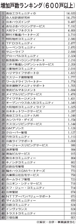 各社の適正評価制度への取り組みと「管理戸数ランキング」との関係が注目される。 増加戸数ランキング(600戸以上) 1,長谷工コミュニティ※,14,920 2,合人社計画研究所,14,279 3,日本ハウズイング,9,487 4,あなぶきハウジングサービス,7,192 5,大和ライフネクスト,4,806 6,野村不動産パートナーズ,3,719 7,明和地所コミュニティ,2,980 8,TFDコミュニティ,2,877 9,レーベンコミュニティ,2,870 10,サニーライフ,2,688 11,グローバルコミュニティ,2,324 12,阪急阪神ハウジングサポート,2,216 13,三井不動産レジデンシャルサービス,2,208 14,三菱地所コミュニティ,2,016 15,ハリマライフサポート※,1,822 16,エスリード建物管理,1,777 17,ワールドライフパートナー,1,774 18,東京建物アメニティサポート,1,705 19,東武ビルマネジメント,1,684 20,メイプルリビングサービス,1,478 21,アイワマネージメント,1,431 22,オープンハウス合人社コミュニティ,1,349 23,大和地所コミュニティライフ,1,325 24,日本ネットワークサービス,1,287 25,長谷工コミュニティ九州,1,248 26,カシワバラ・デイズ,1,154 27,エスコンリビングサービス,1,144 28,GMアソシエ,1,128 29,クローバー管理,1,127 30,穴吹コミュニティ,1,113 31,日昌ライフサポート,1,008 32,フージャースリビングサービス,986 33,浪速管理,984 34,南海ビルサービス,915 35,新日本コミュニティー,864 36,キノシタコミュニティ,862 37,近鉄住宅管理,790 38,積水ハウスGMパートナーズ,773 39,兵庫県公社住宅サービス,758 40,ホームライフ管理,723 41,ユニオン・シティサービス,718 42,エフ・ジェー・コミュニティ,714 43,日神管財,674 44,NTTアーバンバリューサポート,673 45,マイムコミュニティー,659 46,日鉄コミュニティ,624 47,インヴァランス,624 48,トラストコミュニティ,619 49,三信住建,601 ※買収・合併・事業譲渡含む