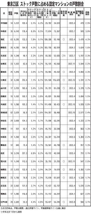 ストック戸数に占める割合が5%を超えるのは千代田・港・中央・新宿の都心4区に江東・渋谷・北を加えた7区。最も割合が低かったのは中野区で1・6%。