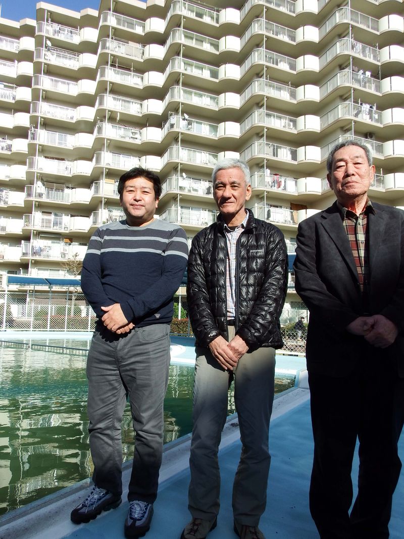 今後の課題はこの排水管改修に加え、委託管理内容の見直し、敷地内のプール。それぞれ施設委員会、管理委員会、プール委員会を設置した。プールは基本的に理事会メンバーで運営しており、今後の利用を含め住民アンケートを実施し検討する。 左から副理事長でプール委員会委員長の白水慶太さん、理事長で管理委員会委員長の富川薫さん、副理事長で施設委員会委員長の近江利政さん。写真に写る敷地内プールの運営をどうしていくかが今後の課題だという