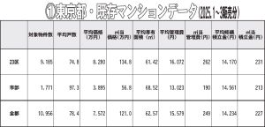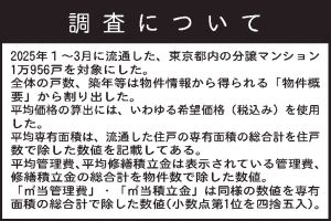25年1~3月に流通した東京都内の既存分譲マンション1万956戸(件)を対象に平均管理費・修繕積立金、1平方メートル当たりの価格等のデータをまとめた(表①・平均管理費等の算出方法は「調査について」参照)。