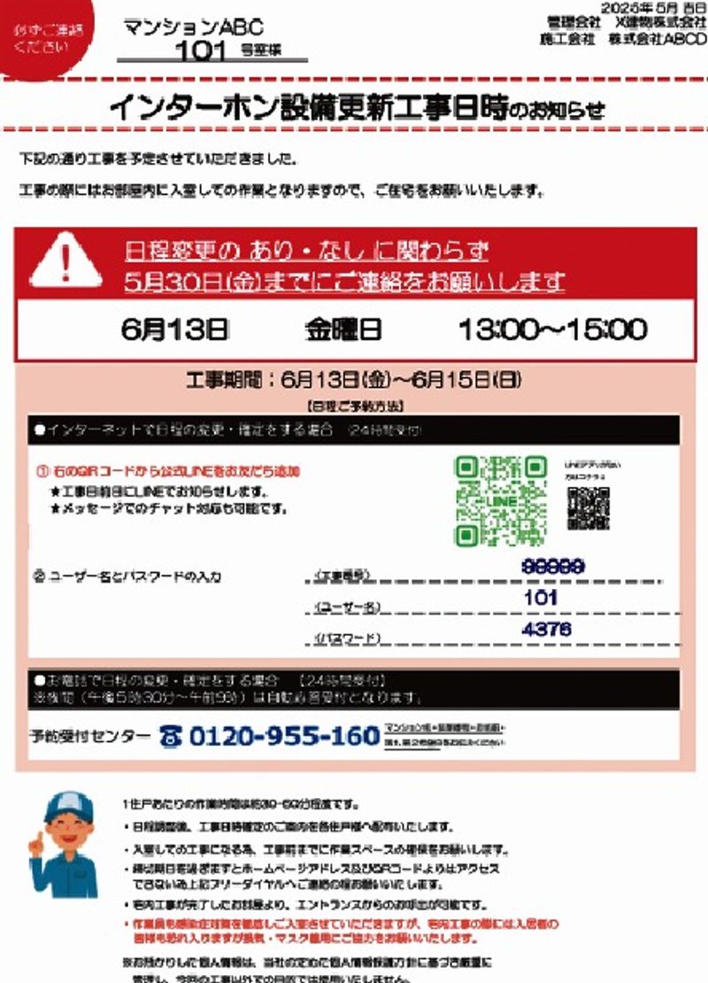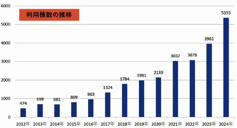 各戸に立ち入っての工事や点検の際には、居住者との日程調整が必要だ。ネスペ(本社大阪、木村有一社長)は工事業者や点検業者に代わって、コールセンターとWEBで受け付けるサービスを13年前から開始、人気を博している。受け付け機能に通信アプリ「LINE」活用も加わり、急激に利用実績を伸ばしている。居住者配布資料とLINE画面のサンプル 左グラフはネスペの日程調整サービスの利用棟数推移だ。2024年は前年比35%増の5355棟と急激に伸びた。最大の理由は、居住者から日程調整を受け付けるシステムに新たにLINEによる予約機能が加わり格段に利便性がアップしたためだ。
