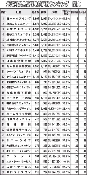 /2025年版/地域別総合管理受託戸数ランキング/〈関 東〉/全国10地域に区分管理協会員対象/上位30社を掲載/日本ハウズイング 首位守る/トップ3に変動なし