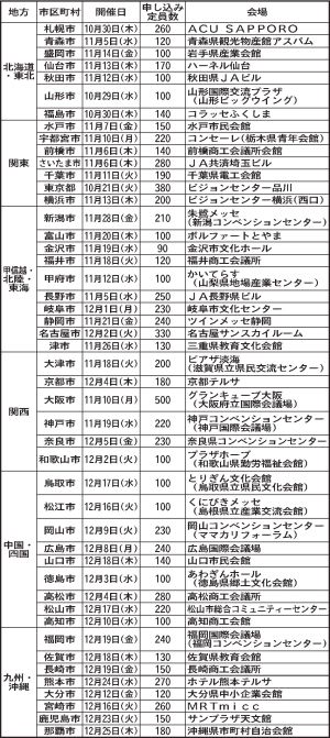 各地域の開催日や会場などは表参照。東京以外は県庁所在地で実施する。
