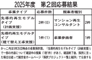 国土交通省は9月26日、2025年度「マンションストック長寿命化等モデル事業」の第2回募集分の採択プロジェクトを公表した(表参照)。