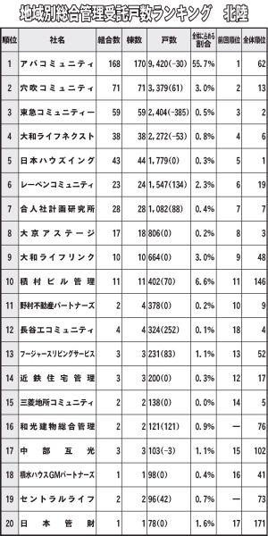比率は全体に占める割合 マンション管理新聞社が実施する地域別の総合管理受託戸数調査。8月から2025年版の調査結果を発表しています。調査対象は一般社団法人マンション管理業協会(管理協)の会員社。このうち公表の同意が得られた事業者の受託戸数をランキングしました。今回は北陸地域における調査結果を掲載します。