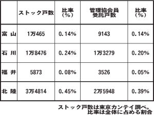 富山・石川・福井県の北陸地方におけるマンションストック戸数は東京カンテイの調べでは昨年12月末時点で3万4814戸(下表参照)。全国の総ストック戸数(770万2392戸=東京カンテイ調べ)の0・45%を占める。