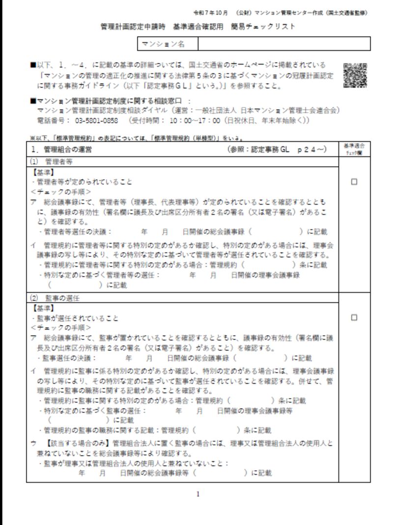 公益財団法人マンション管理センターは10月15日、管理計画認定申請時の基準適合確認用の簡易チェックリスト(写真)をホームページで公開した。