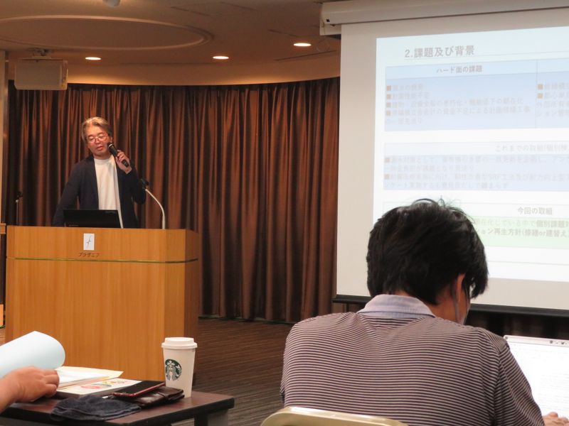 24年度第1回募集で先導的再生モデルタイプ(計画支援)に採択された東京都品川区の「マンション五反田」(1979年竣工。14階建て194戸)。提案者は東急コミュニティー。発表者は同社の柴田篤氏。