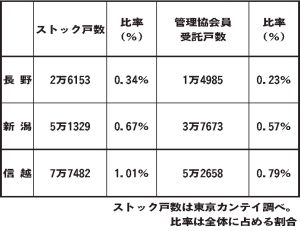 長野・新潟県の信越地域におけるマンションストック戸数は東京カンテイの調べでは昨年12月末時点で7万7482戸(下表参照)。全国の総ストック戸数(770万2392戸=東京カンテイ調べ)の1・01%を占める。