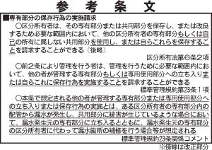 「専有部分の保存行為の実施請求」(区分所有法6条2項)は、従来の立ち入り権を含む「使用」に加え区分所有者自ら保存請求ができることを明確化する改正を行った(表に条文)。標準管理規約も法改正の趣旨を踏まえ、条文を一部変更した(23条1項)。