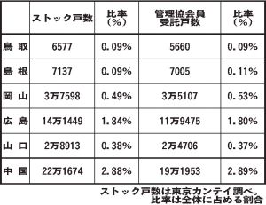 鳥取・島根・岡山・広島・山口県の中国地域におけるマンションストック戸数は東京カンテイの調べでは昨年12月末時点で22万1674戸(下表参照)。全国の総ストック戸数(770万2392戸=東京カンテイ調べ)の2・88%を占める。 管理協による会員の総合管理受託戸数は今年4月1日時点で19万1953戸。こちらは管理協会員全受託戸数の2・89%に当たる。◇