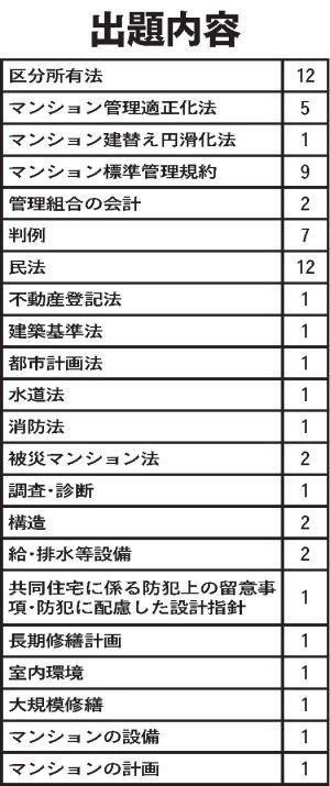 出題内容は表の通り。複合的な知識を問う設問もあり、問題数とは一致していない。出題される法令などの範囲は今年4月1日施行分まで。5月に改正された区分所有法・マンション管理適正化法・マンション建替え円滑化法、10月に改正されたマンション標準管理規約の変更箇所は試験範囲外。