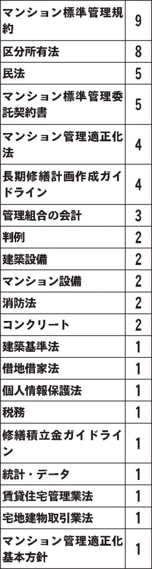 マンション標準管理規約,9 区分所有法,8 民法,5 マンション標準管理委託契約書,5 マンション管理適正化法,4 長期修繕計画作成ガイドライン,4 管理組合の会計,3 判例,2 建築設備,2 マンション設備,2 消防法,2 コンクリート,2 建築基準法,1 借地借家法,1 個人情報保護法,1 税務,1 修繕積立金ガイドライン,1 統計・データ...