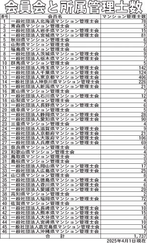 会員会と所属管理士数 番号,会員名,マンション管理士数 1,一般社団法人北海道マンション管理士会,78 2,青森県マンション管理士会,5 3,一般社団法人岩手県マンション管理士会,15 4,一般社団法人宮城県マンション管理士会,81 5,秋田県マンション管理士会,6 6,山形県マンション管理士会,7 7,福島県マンション管理士会,6 8,一般社...