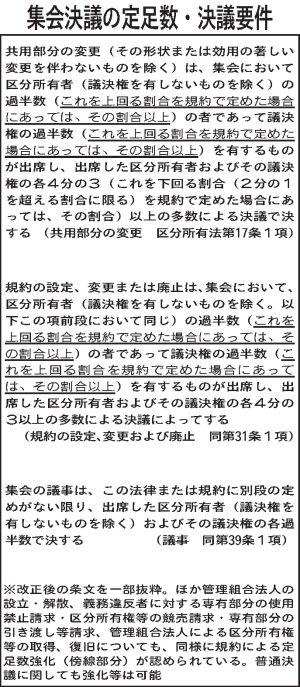 集会決議の定足数・決議要件 共用部分の変更(その形状または効用の著しい変更を伴わないものを除く)は、集会において区分所有者(議決権を有しないものを除く)の過半数(これを上回る割合を規約で定めた場合にあっては、その割合以上)の者であって議決権の過半数(これを上回る割合を規約で定めた場合にあっては、その割合以上)を有するものが出席し、出席した区分所...