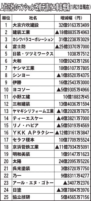 上位25社のマンション改修元請け工事高増減(1月21日現在) 順位,社名,増減幅(円) 1,大京穴吹建設,32億9163万3499 2,建装工業,▲18億8835万4963 3,カシワバラコーポレーション,31億2238万3029 4,富士防,▲25億3370万7000 5,日装・ツツミワークス,1038万7512 6,大和,10億9243万...